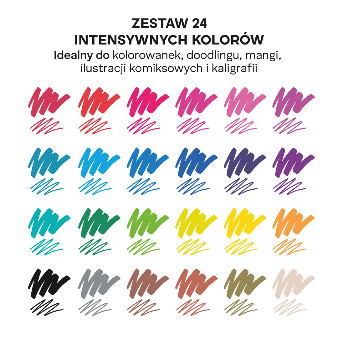 Zestaw zawiera 24 intensywnie napigmentowane kolory, które sprawią, że Twoje prace ożyją. Paleta została starannie dobrana, oferując idealną mieszankę odcieni podstawowych, pastelowych i głębokich.